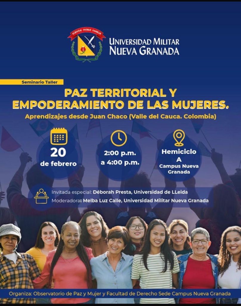 En el marco de las actividades académicas del Observatorio de Paz y Mujer de la Universidad Militar Nueva Granada, en alianza con la Facultad de Derecho – Campus Nueva Granada, se realizó el Seminario–Taller “Paz territorial y empoderamiento de las mujeres: aprendizajes desde Juan Chaco (Valle del Cauca, Colombia)”, espacio orientado a reflexionar sobre el papel de las mujeres en los procesos de construcción de paz territorial y desarrollo comunitario en contextos afectados por el conflicto armado.